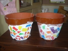 ○カラフルタイルを手やかなづちで割って、セメントをぬった鉢にペタペタ貼ったよ!