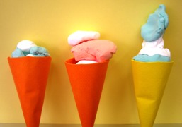 白、赤、緑と3色の紙粘土をこねる、ちぎる、のばすなどして、 ソフトクリームやアイスクリームをつくりました。 紙のコーンの中に、紙粘土を重ねて入れて2段重ねや 3段重ねのアイスクリームができたよ。 紙粘土を細長くのばして、背の高いソフトクリームもたくさんつくったよ。 ミルク味、いちご味、そしてメロン味・・・どれがおいしいかな?