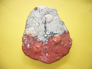 2色の土粘土を使って、時計作りに挑戦しました。こねて、伸ばしたあと、引っかいたり、スタンプで型を押したり、数字を貼り付けたりして土台を作りました。そして、素焼きをした後、色つけをして釉薬を塗り、本焼きをして完成!11人の「最高」の12才の時計です。
