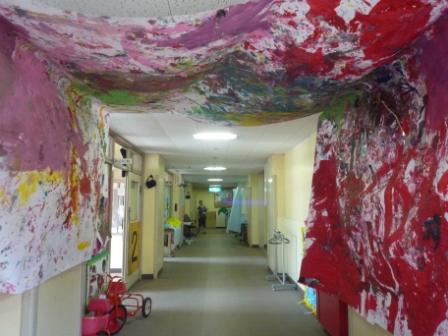 大きな紙に全身を使ってぬたくりをしました。2年生では、ローラーに挑戦!腕を左右に大きく動かしてたくさん描きました。大きな紙は『ぬたくりトンネル』に変身だ!!